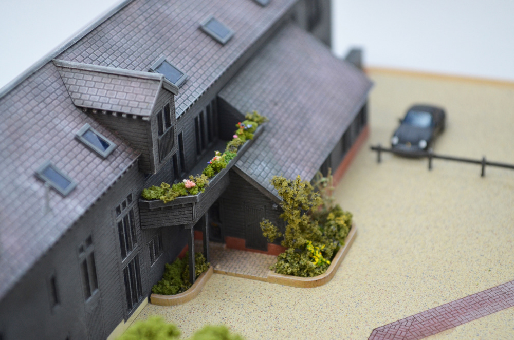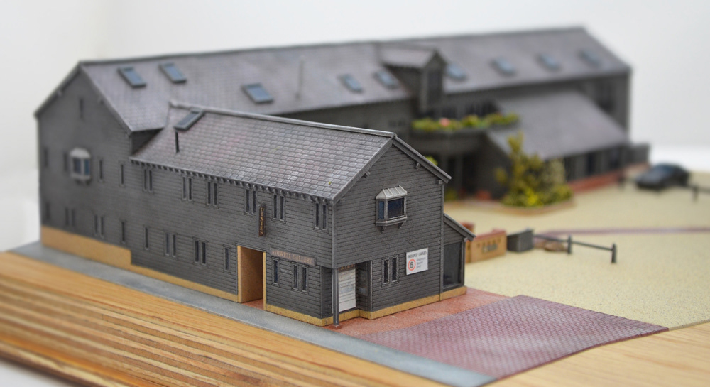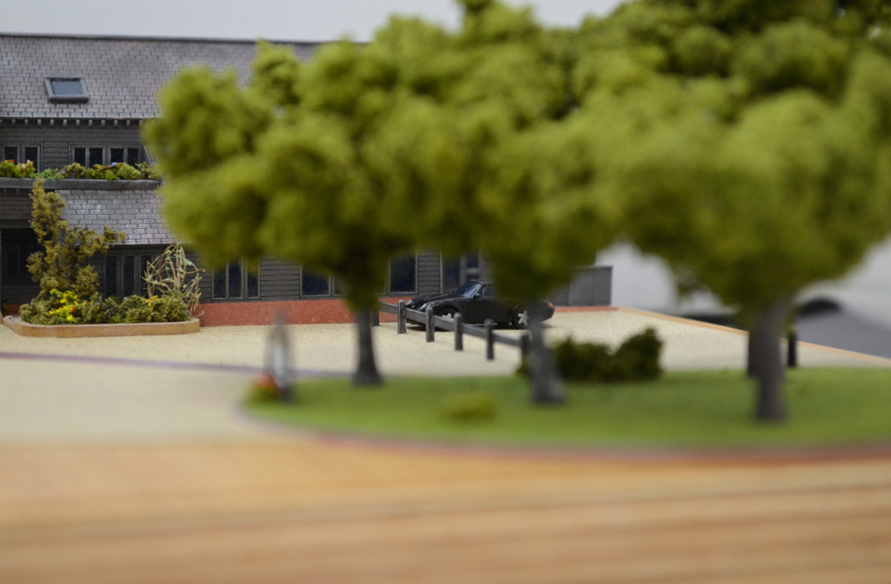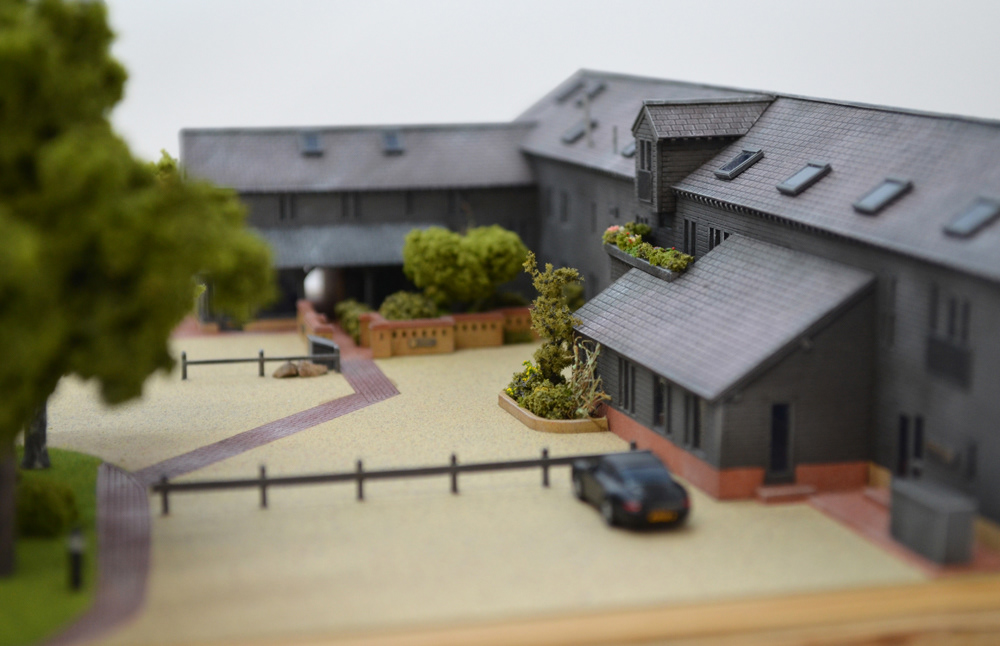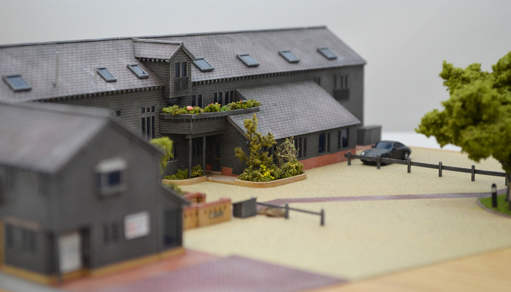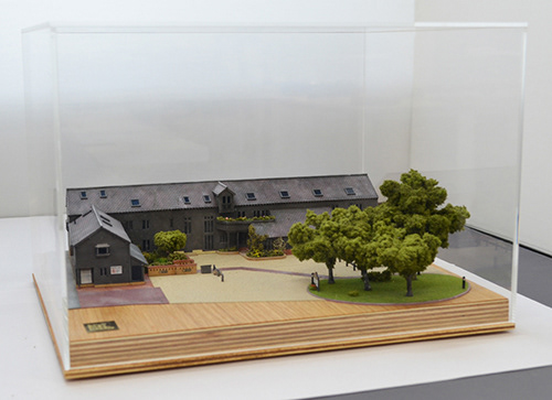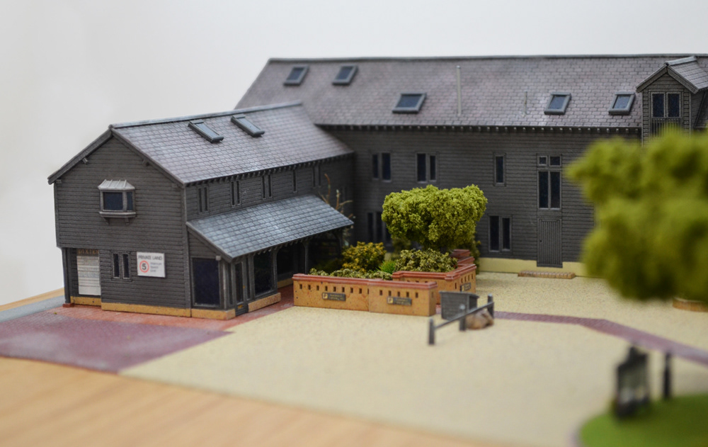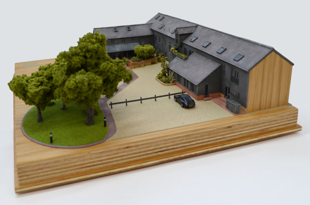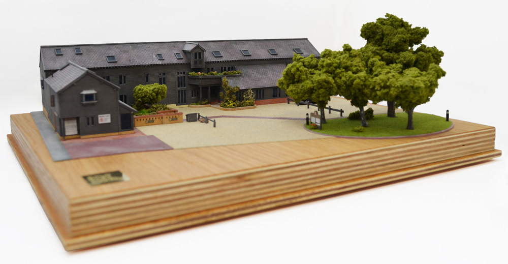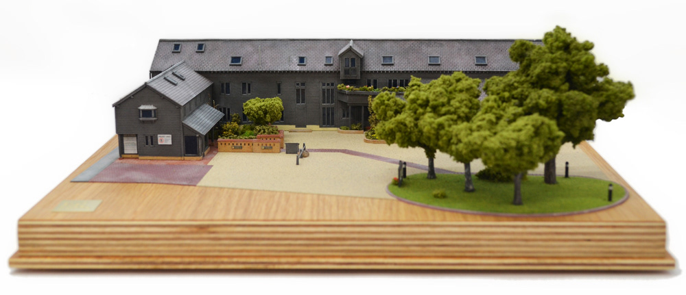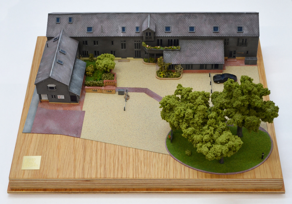 This small model was commissioned by CSA Environmental as a retirement gift. It is an architectural model of Dixies Barns, in Ashwell, Hertfordshire, where CSA Environmental have their head office. Finding a scale that showcased the architectural detail of the building and landscaping but at a manageable display size for a bookshelf or coffee table was key. At 1:150 the details are very small but are enough to give the model character whilst showing the overall layout in context. The model is finished in oak veneer and enclosed in an acrylic display case.