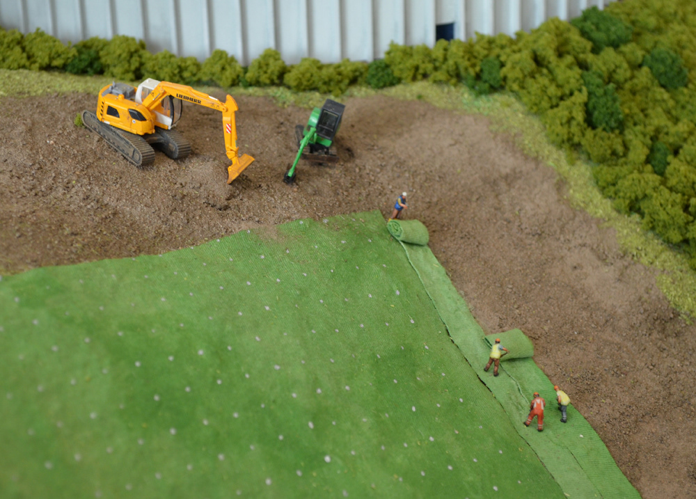 The purpose of the model is to showcase the various industries and applications in which Gripple products are used. These include high rise buildings, fencing, vineyards, solar farms, soil erosion control, railways and sports stadiums. The challenge was to create a model that could show all these in a fun and recognisable way, whilst also tying together somewhat realistically despite mismatching scales. Added to this is a representation of the Old West Gun Works in Sheffield - Gripple HQ, the only element of the scale model to exist in reality. The model base is approximately 1.5m in diameter, which helped to establish 1:200 as the 'foundation' scale from which there was creative licence to incorporate other scale elements where appropriate.