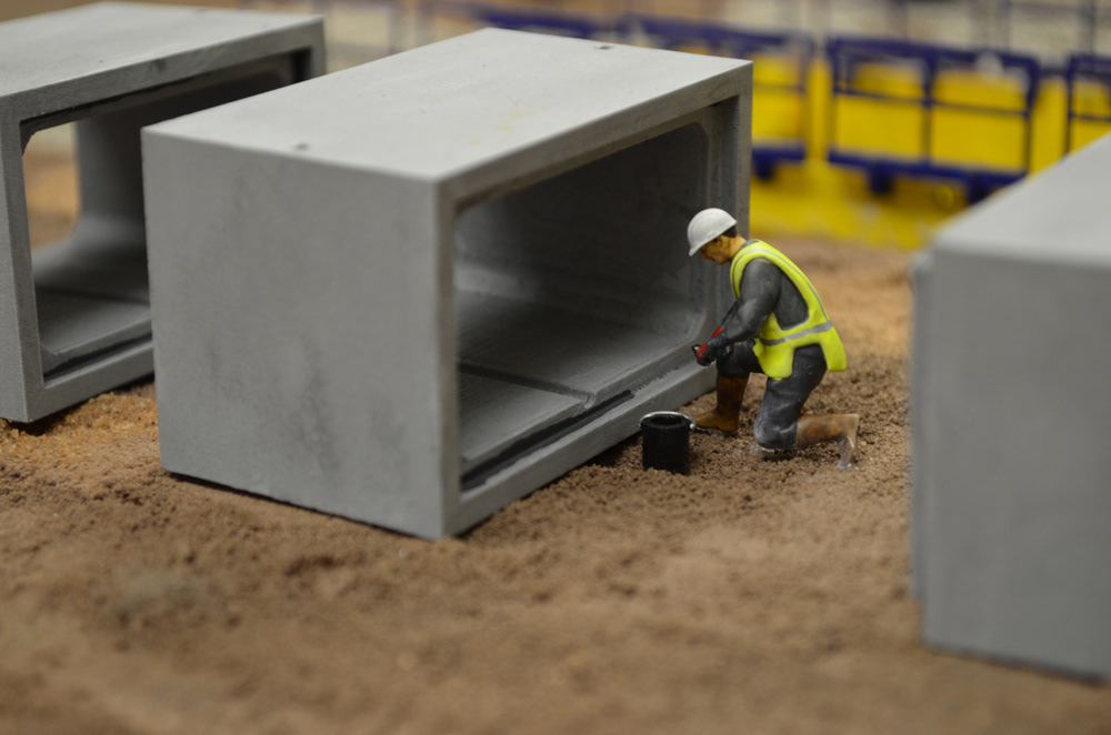 This model of a construction site sits within a new bespoke boardroom table in the Leeds headquarters of Howard Civil Engineering. It was designed and made at 1:50 scale to demonstrate the various processes involved within a typical road construction project that would be undertaken by the company. This includes representation of surface and base courses that make up road layers, installation of kerbs, levelling earth, formwork panels ready for concrete, and preparing and digging a trench to install box culverts. It's a great example of a model that is mostly made using traditional model making techniques but with the addition of highly detailed bespoke 3D printed miniatures and parts.
