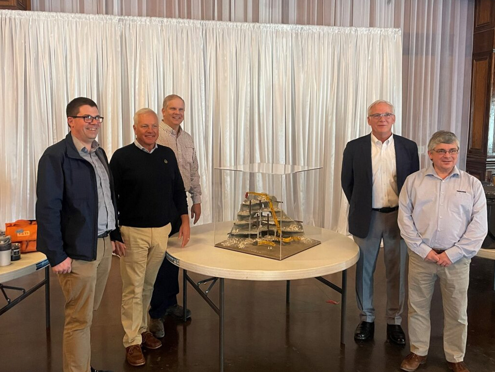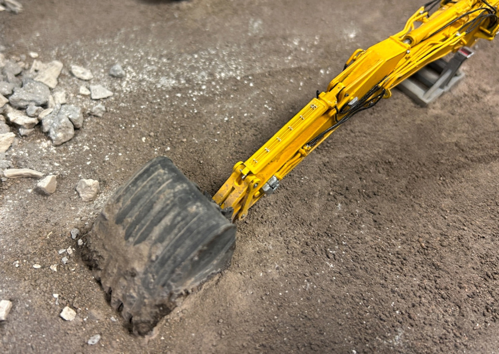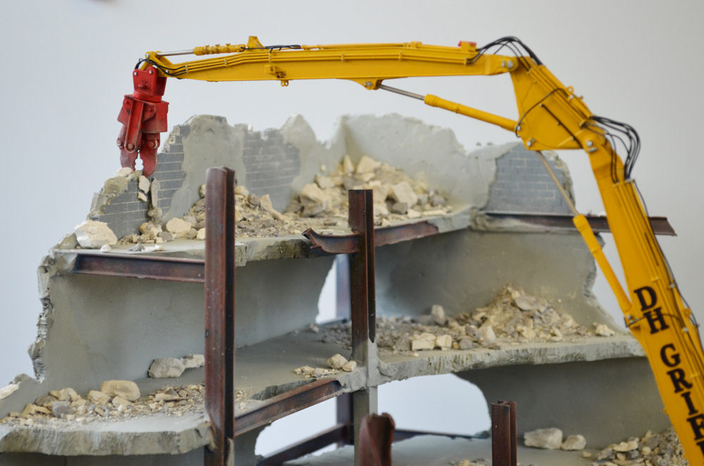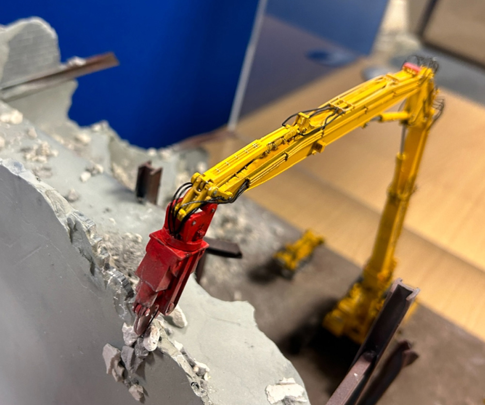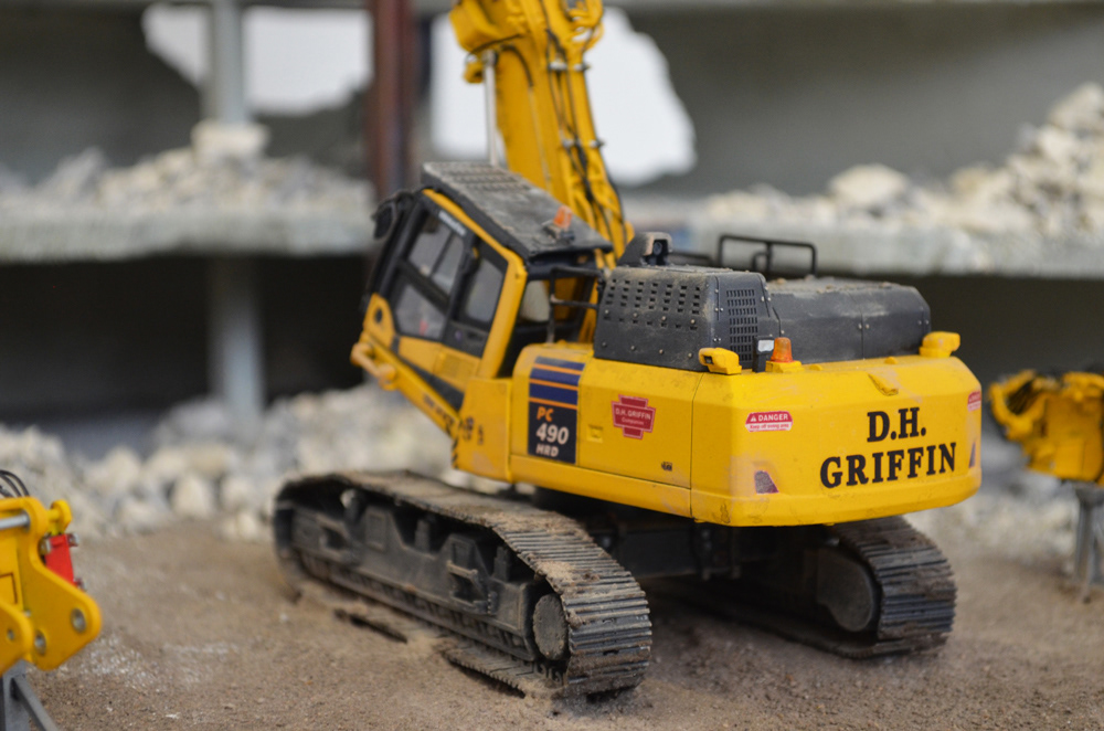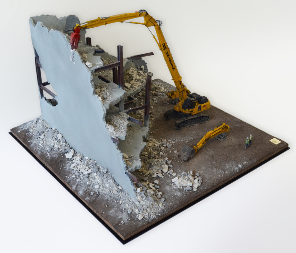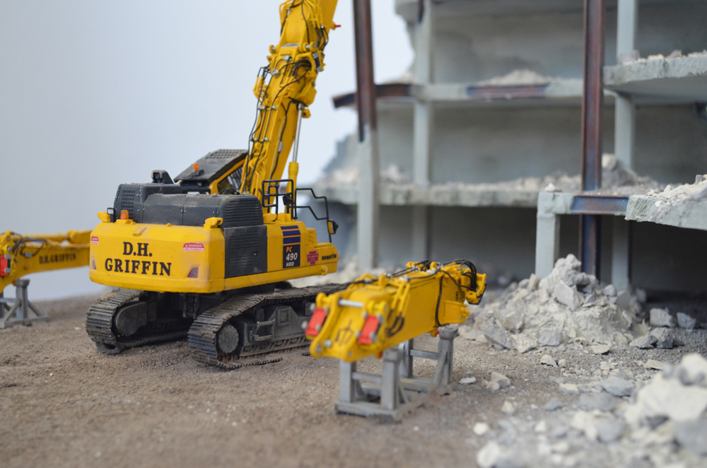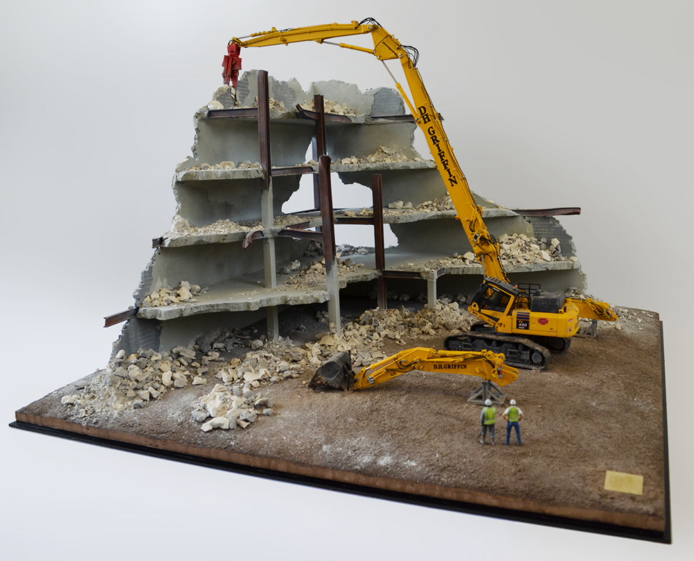 Commissioned by Komatsu UK to present to one of their prestigious clients, this 1:50 scale diorama features a model of the PC490HRD High reach demolition excavator, in action demolishing a building, alongside a digger boom and extension boom. The model is a great example of traditional modelling techniques alongside modern 3D printing technology. The main body of the machine was adapted from a diecast scale model of a similar excavator, with newly constructed undercarriage, booms and details, including hand made cable and pipework additions.