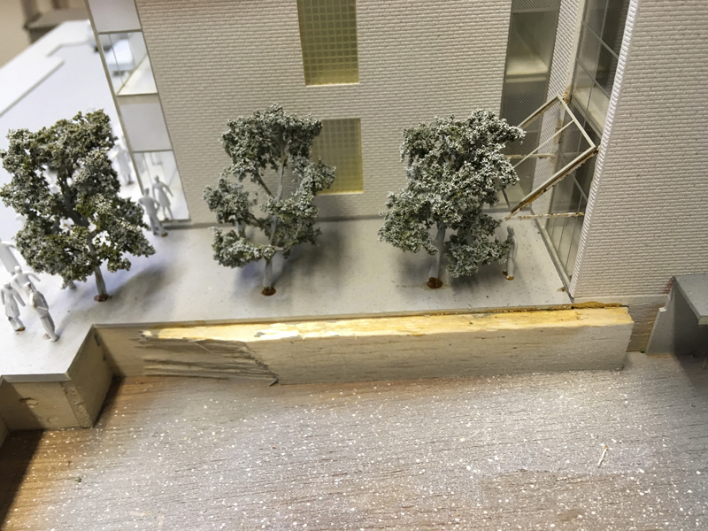Firstly, the process of restoration began by removing and discarding the broken acrylic display case and white acrylic edge pieces which were split from the screws used to fix the case to the model. From there I investigated which elements of the model could be restored. Chief amongst the problems were the metal photo etched elements that had become rusted and brittle and required replacement. These included the rear window frames and mullions, wall railings and canopy structures. The glue used to fix these parts, as well as the figures, trees and cars had over time turned brown and stained areas of the model. Underneath the model, a single light was removed and the supporting plastic and transformer which had perished from the heat of the bulb. It was deemed too dangerous and destructive to tackle the deterioration to the interior of what had now become a very delicate model as this would result in remaking much of the model. Most of these issues cannot be easily seen and wouldn’t detract from the final result.
