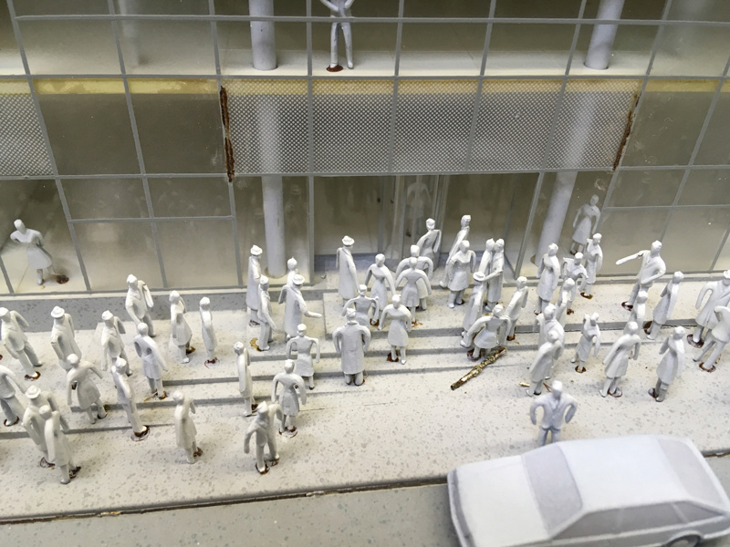 To gain access to the trees and canopies on one side of the model I removed the adjacent building. From there I was able to remove all the figures and trees, not without firstly recording their positions. All the rusted metal elements were removed and the entire glue residue scraped from the model. One of the trickiest aspects of restoring the model was colour matching the existing colours to hide the brown stains, a process that would if matched correctly negate the need to re-spray massive areas of the model. This was successful in all areas except the roof above the front projection which required masking and spraying around the perimeter. The cars were too delicate to remove for respraying.