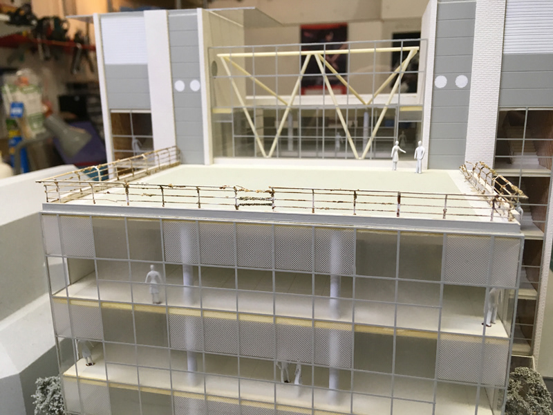 CAD drawings were created for the rear window frames and mullions, wall railings and canopy structures and new brass etched parts made, sprayed white and fixed in place (once the surrounding areas had been cleaned and touched up), with a new plastic canopy made for the front entrance that had previously disappeared.